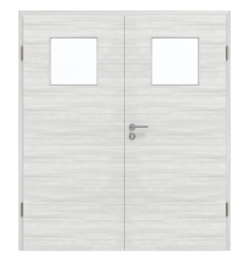 Drzwi dwuskrzydłowe nadają się zarówno do pomieszczeń prywatnych, jak i biurowych. Dzięki rdzeniowi z pełnej płyty wiórowej spełniają wymagania grupy obciążenia M. Oprócz skrzydła czynnego i biernego w zakres dostawy wchodzi również ościeżnica, zamek na klucz piórowy oraz zawiasy.