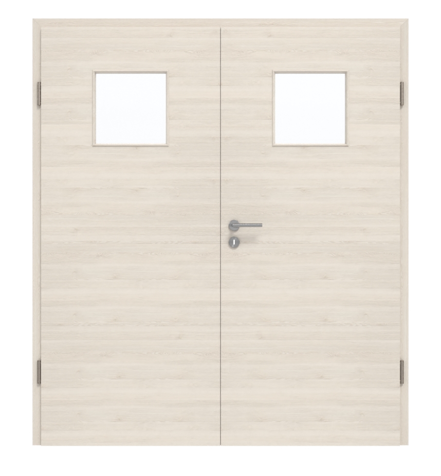 Rdzeń drzwi dwuskrzydłowych wykonany jest z płyty wiórowej pełnej. Zgodnie z grupą obciążenia M mogą być stosowane w pomieszczeniach prywatnych lub komercyjnych. W zestawie oprócz dwóch skrzydeł drzwiowych znajdują się również pasująca ościeżnica, zawiasy i zamek na klucz.