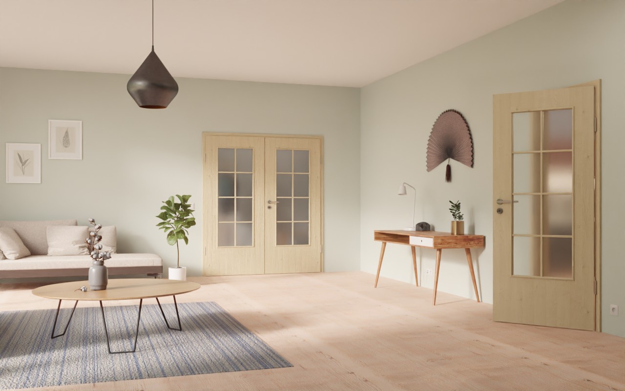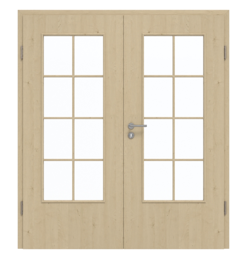 Duże przeszklenie w każdym skrzydle drzwiowym zapewnia światło w pomieszczeniu. Drobne szprosy dzielą szkło za optycznie na osiem równych prostokątów. Wzór Natura Klon zachwyca naturalnym wyglądem drewna o podłużnych słojach, charakteryzującym się jasnymi i delikatnymi wzorami. Ten nadający się do codziennego użytku laminat jest łatwy w pielęgnacji i wyjątkowo wytrzymały.