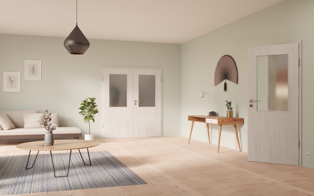 Podwójne drzwi wewnętrzne wykonane są z rdzenia z pełnego wióru. Dzięki temu odpowiadają grupie obciążeniowej M i mogą być używane zarówno w przestrzeni prywatnej, jak i biurowej. W skład dostawy wchodzą oba skrzydła drzwiowe, ościeżnica, zawiasy i zamek z kluczem.