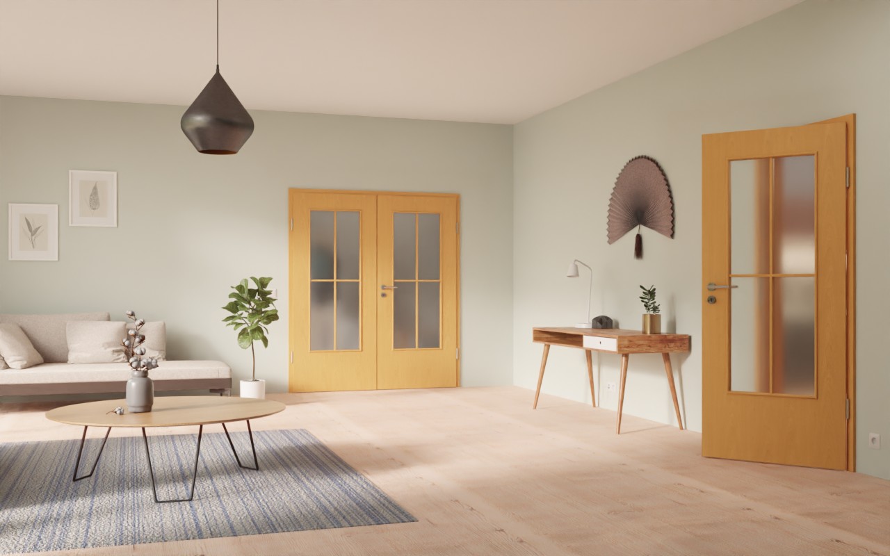 Prostokątne przeszklenia zajmują większość powierzchni skrzydeł drzwi, zapewniając w ten sposób przyjemny dopływ światła. Delikatne, naszywane szprychy nadają im piękną symetrię. W dekorze Buk Ekskluzywny dominują subtelne, delikatne słoje. Ten dekoracyjny laminat jest odporny na zabrudzenia, uderzenia i zarysowania.