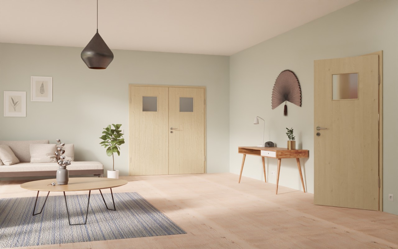 W górnej części skrzydła drzwiowego znajduje się kwadratowe przeszklenie. Dekor Natura Ahorn, dzięki drobnym usłojeniom i jasnej kolorystyce, tworzy spokojną atmosferę. Łatwa w pielęgnacji warstwa wierzchnia charakteryzuje się ponadto wysoką odpornością na uderzenia i zarysowania.