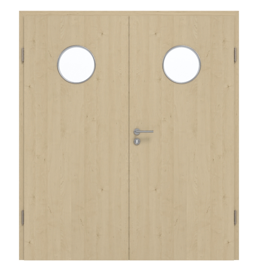 Dzięki okienkom w górnej części drzwi do pomieszczenia może wpadać dodatkowe światło. Na pionowym dekorze HPL w kolorze naturalnego klonu rozciąga się naturalny, wzdłużny wygląd drewna, charakteryzujący się jasnymi, filigranowymi usłojeniami. Ponadto ta łatwa w pielęgnacji warstwa wierzchnia wykazuje się wyjątkową odpornością na ścieranie i zarysowania.
