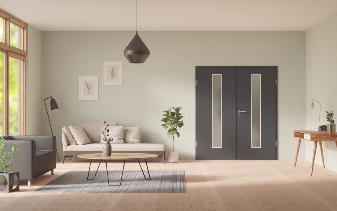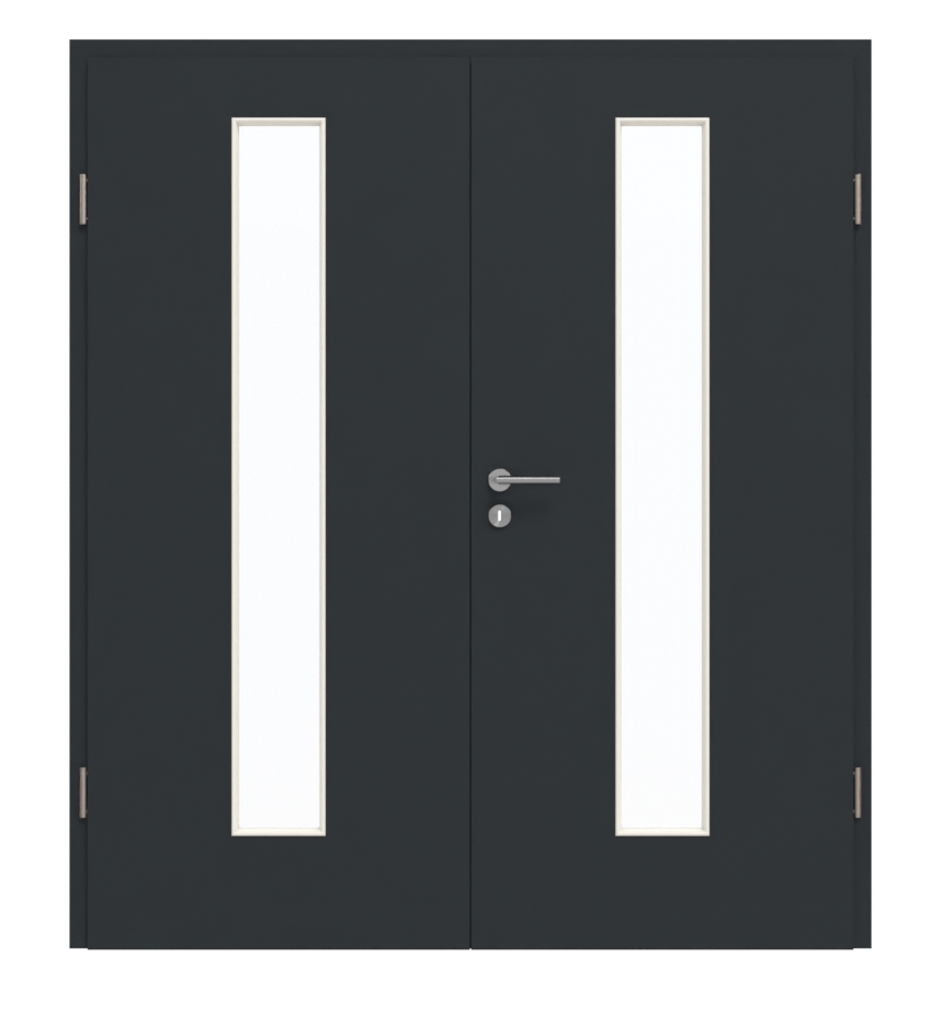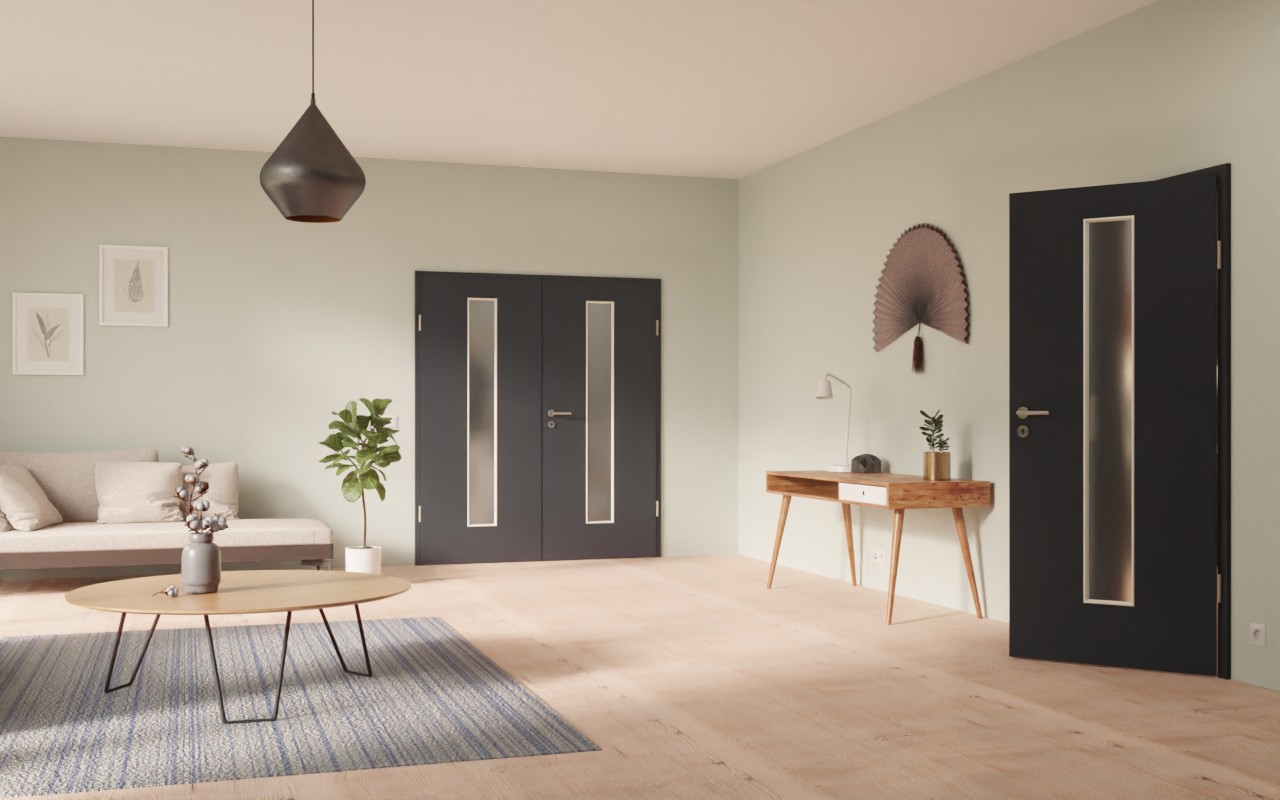 Skrzydła drzwi zdobią pośrodku smukłe szklane wstawki. Dekor HPL w kolorze czarnym wulkanicznym charakteryzuje się jednolitym i imponującym odcieniem czerni. Delikatna ziarnistość nadaje drzwiom atrakcyjną fakturę. Ten odporny na uderzenia i zarysowania laminat jest wyjątkowo łatwy w pielęgnacji.