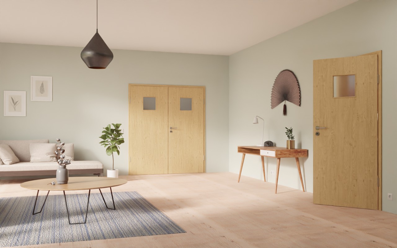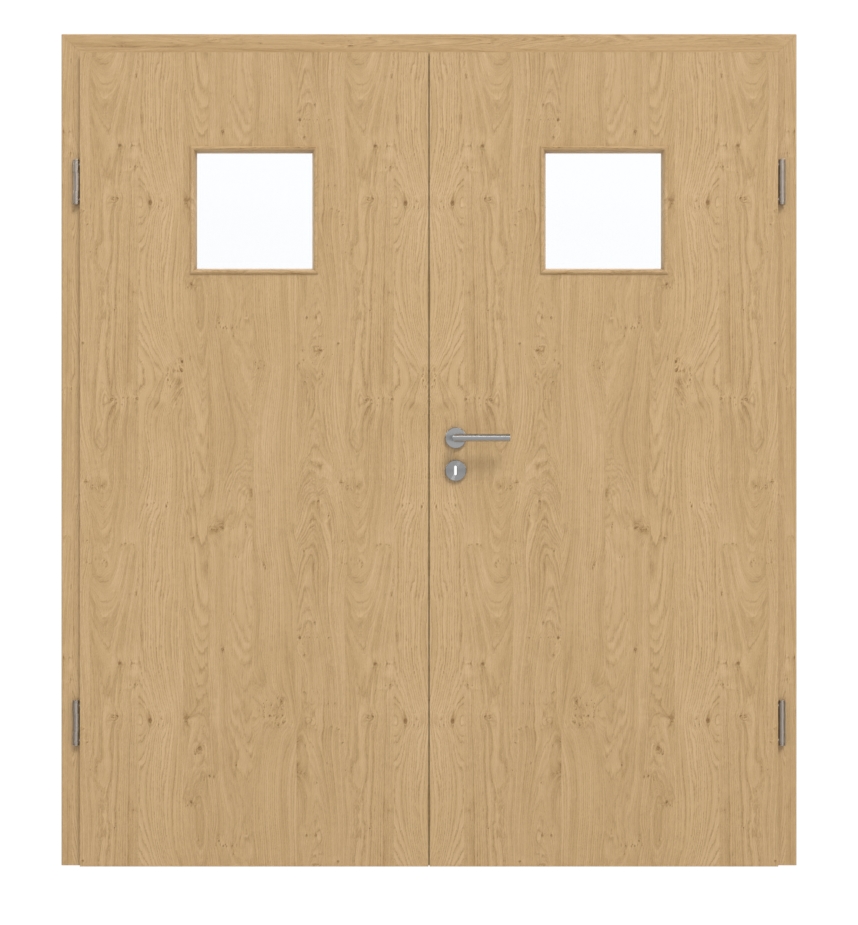 Drzwi dwuskrzydłowe mają środkową warstwę z płyty wiórowej. Posiada certyfikat klasy wytrzymałości M i jest przeznaczona do użytku w pomieszczeniach prywatnych lub biurowych. Podana cena obejmuje oba skrzydła drzwiowe, pasującą ościeżnicę, zamek na klucz oraz zawiasy.