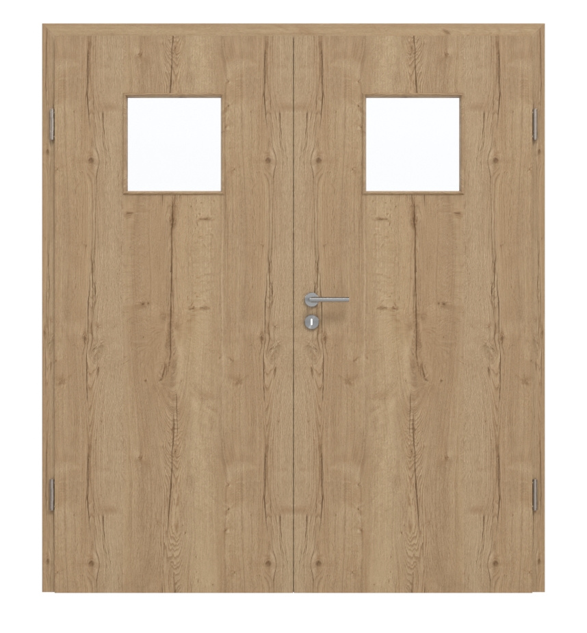 Drzwi dwuskrzydłowe mają rdzeń z pełnego wióru. Są certyfikowane w grupie obciążeniowej M i przeznaczone do użytku w pomieszczeniach prywatnych lub biurowych. Ościeżnica, zawiasy i zamek z kluczem są już wliczone w cenę.