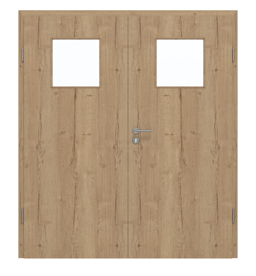 Drzwi podwójne mają rdzeń z pełnego wióru. Są certyfikowane w grupie obciążeniowej M i przeznaczone do użytku w pomieszczeniach prywatnych lub biurowych. Cena obejmuje oba skrzydła drzwi, odpowiednią ościeżnicę, zawiasy oraz zamek wielozadaniowy.