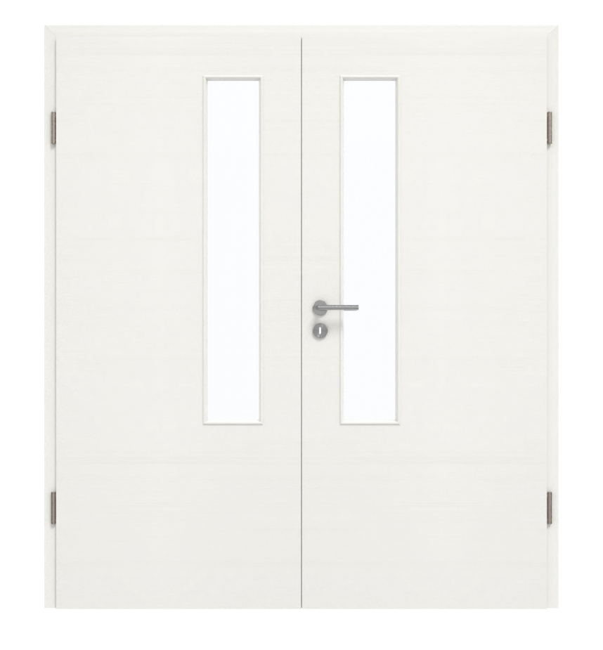 Krótkie, wąskie przeszklenia nadają drzwiom nowoczesny wygląd. Od lewej do prawej strony skrzydło drzwi o kolorze Authentic Bianco DQ pokrywa dyskretny wzór słojów drewna. Dekoracyjna okleina laminowana jest odporna na zabrudzenia, uderzenia i zarysowania.