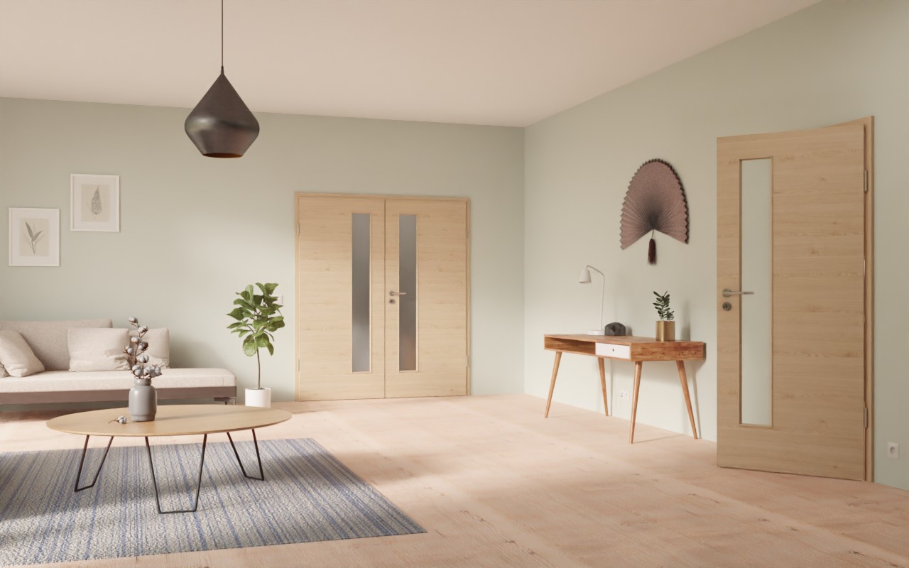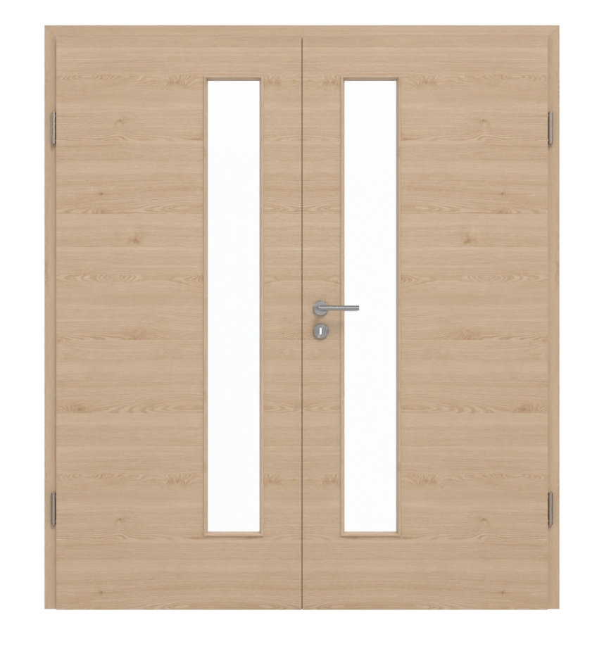 Dzięki środkowej warstwie z litej płyty wiórowej te dwuskrzydłowe drzwi nadają się zarówno do pomieszczeń prywatnych, jak i biurowych. Przetestowane w grupie obciążenia M. Aby całość wyglądała estetycznie, drzwi dostarczane są wraz z ościeżnicą, zamkiem z kluczem oraz zawiasami.