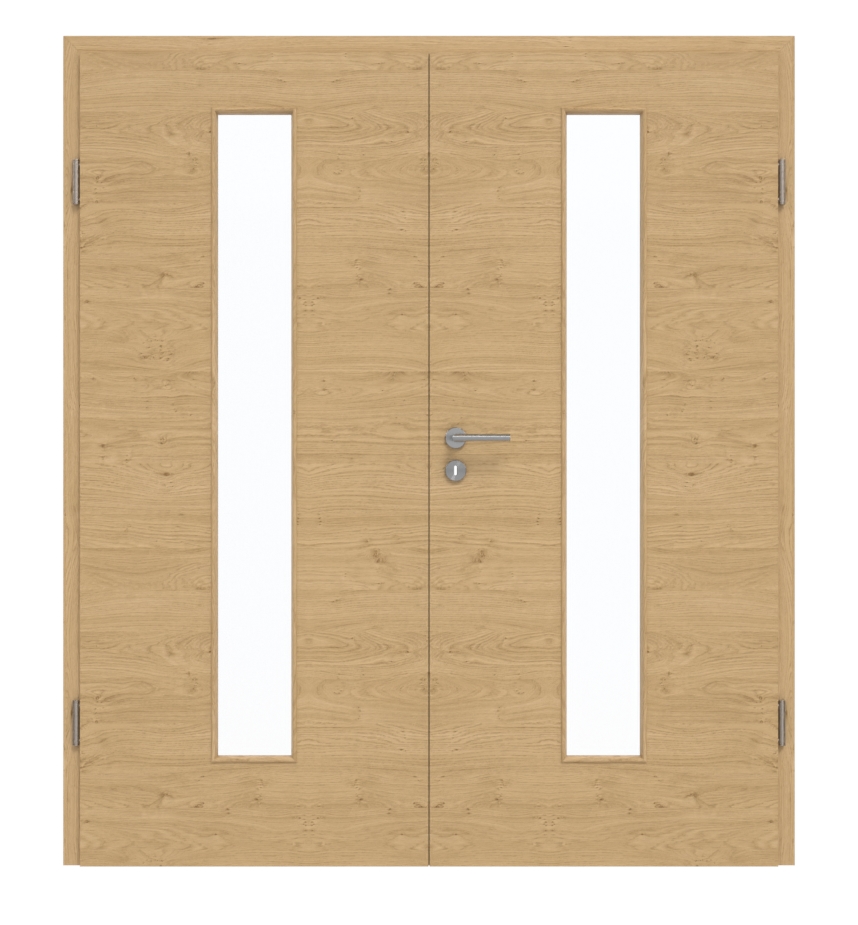 Drzwi dwuskrzydłowe, przetestowane w grupie obciążeniowej M , nadają się zarówno do pomieszczeń prywatnych, jak i biurowych. W rdzeniu wykonane z pełnej płyty wiórowej. Oprócz skrzydeł drzwi w zestawie znajdują się również ościeżnica, zamek i zawiasy.