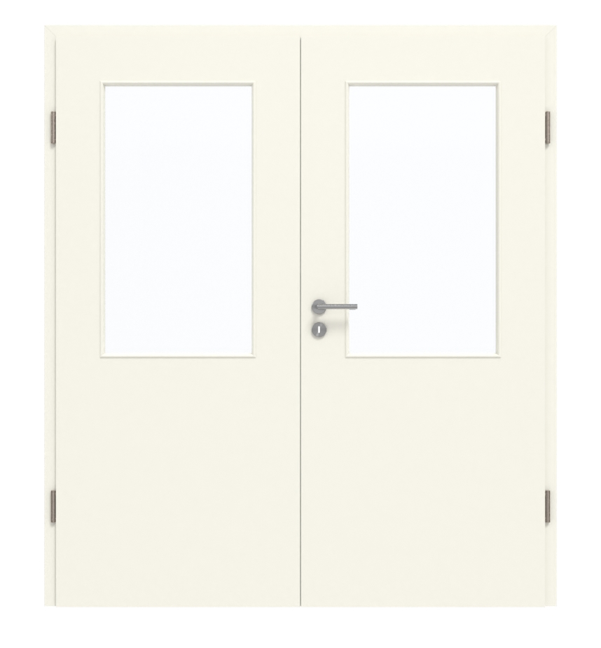 Dzięki prostokątnym wycięciom na szybę w górnej części skrzydeł drzwiowych model ten zapewnia dużo miejsca na piękny dopływ światła. Na powierzchni drzwi wewnętrznych rozciąga się delikatny, naturalny odcień biały, który można łatwo dopasować do każdego wystroju wnętrza. Łatwa w pielęgnacji warstwa wierzchnia charakteryzuje się ponadto wysoką odpornością na uderzenia i zarysowania.