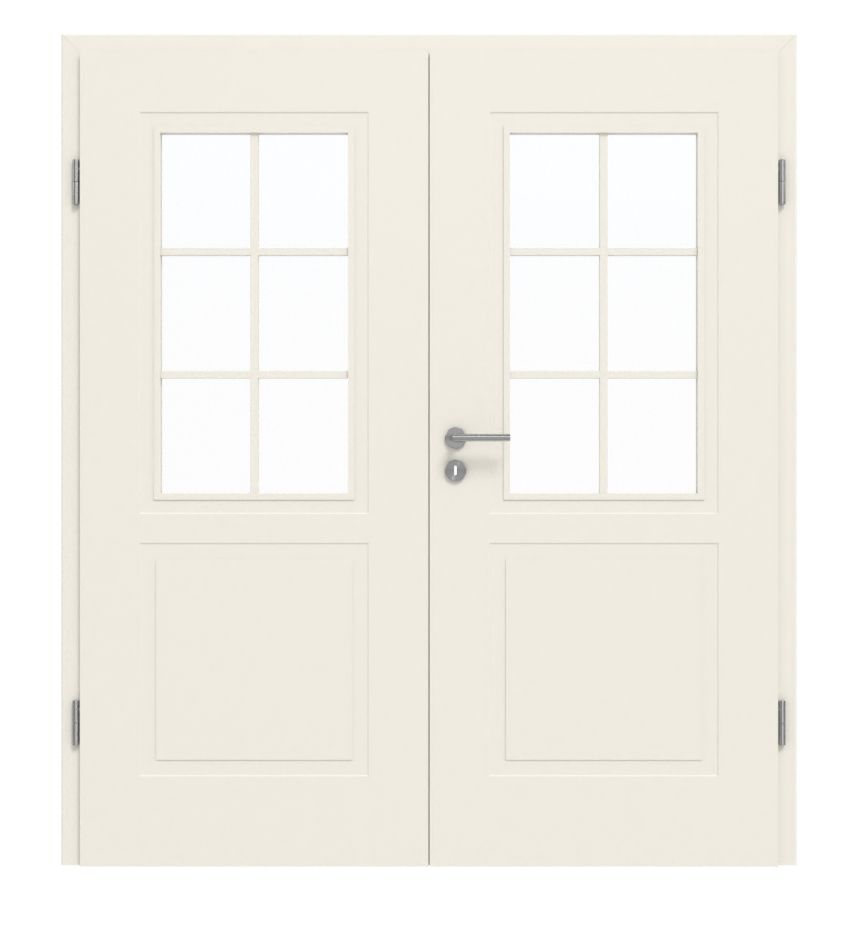 Wyraziste frezowania tworzą nowoczesny wygląd kasetonowy. W górnej połowie drzwi dwa przeszklenia zapewniają dodatkowe oświetlenie pomieszczenia. Symetryczne szprosy stanowią stylowy akcent. Satynowo-matowe białe wykończenie lakiernicze jest nakładane w sposób przyjazny dla środowiska w ramach wielowarstwowego lakierowania i charakteryzuje się odpornością na zarysowania oraz łatwością pielęgnacji.