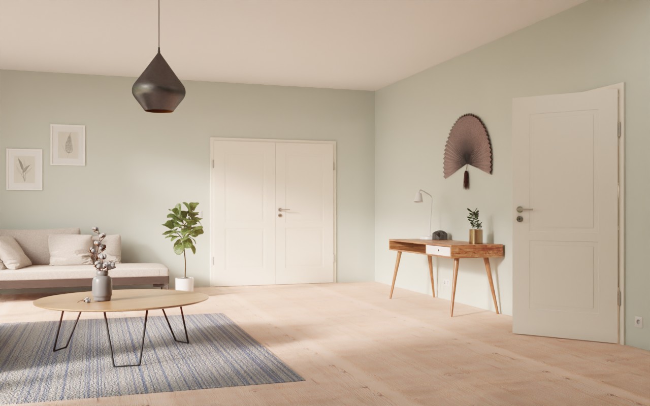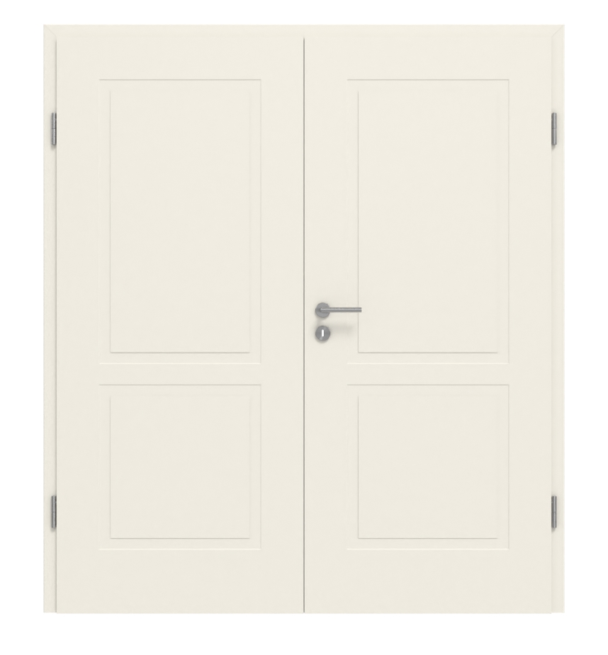 Dzięki wyfrezowanym kasetonom na skrzydłach drzwiowych widoczne są dwa prostokąty o różnych rozmiarach. W przypadku lakieru o satynowym wykończeniu można wybrać jeden z odcieni bieli RAL 9010 i RAL 9016. Lakier nakładany jest w procesie przyjaznym dla środowiska, zapewniając jednolity wygląd i przyjemną w dotyku powierzchnię. Co więcej, wielowarstwowe lakierowanie jest odporne na zabrudzenia i zarysowania dzięki utwardzaniu promieniami UV.