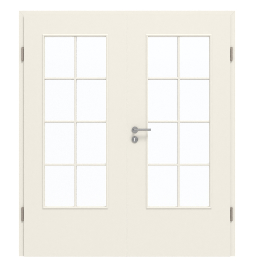 Rdzeń drzwi dwuskrzydłowych wykonany jest z płyty wiórowej litej. Zgodnie z klasą użytkowania M może być zatem stosowany zarówno w pomieszczeniach prywatnych, jak i komercyjnych. Oprócz skrzydeł drzwi w zestawie znajduje się również ościeżnica, zamek i zawiasy.