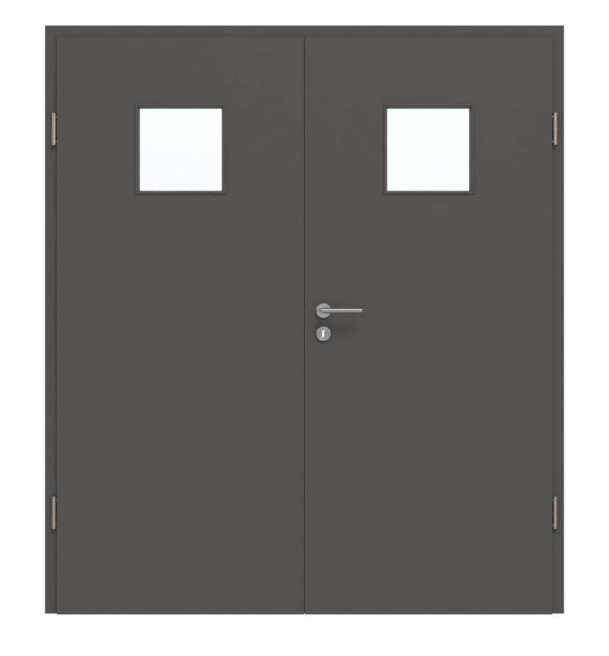 Środkowa część podwójnych drzwi wykonana jest z pełnej płyty wiórowej. Model ten może być stosowany zgodnie z grupą obciążenia M w pomieszczeniach prywatnych lub komercyjnych. Cena obejmuje oba skrzydła drzwiowe, odpowiednią ościeżnicę, zawiasy i zamek na klucz.