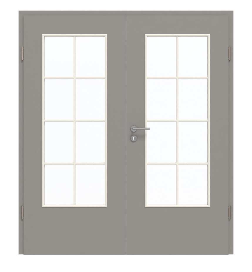 Dwa duże, prostokątne otwory okienne są podkreślone eleganckimi ramami z szprosami. Skrzydło drzwi zachwyca nowoczesnym i jednolitym odcieniem Platingrau, który pokrywa całą powierzchnię. Delikatna faktura piaskowa nadaje dekorowi dodatkowej elegancji. Ponadto warstwa wierzchnia z HPL jest łatwa w pielęgnacji oraz odporna na ścieranie i zarysowania.