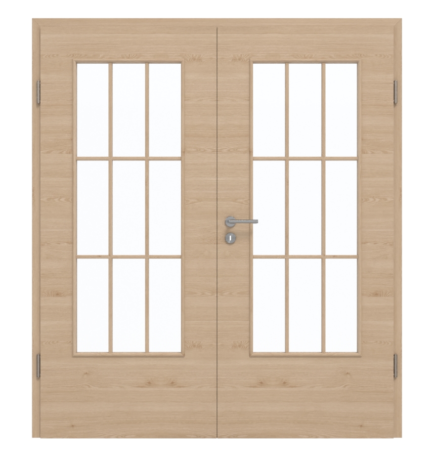Dzięki dużym przeszkleniom drzwi zapewniają piękny dopływ światła. Delikatne ramy z listew dzielą duże prostokąty na po dziewięć mniejszych. Jasne odcienie beżowe i brązowe łączą się w dekorze drewna Authentic Achat DQ z drobnym, wzdłużnym usłojeniem. Materiał laminowany wyróżnia się ponadto wysoką odpornością na obciążenia mechaniczne oraz łatwością pielęgnacji w codziennym użytkowaniu.