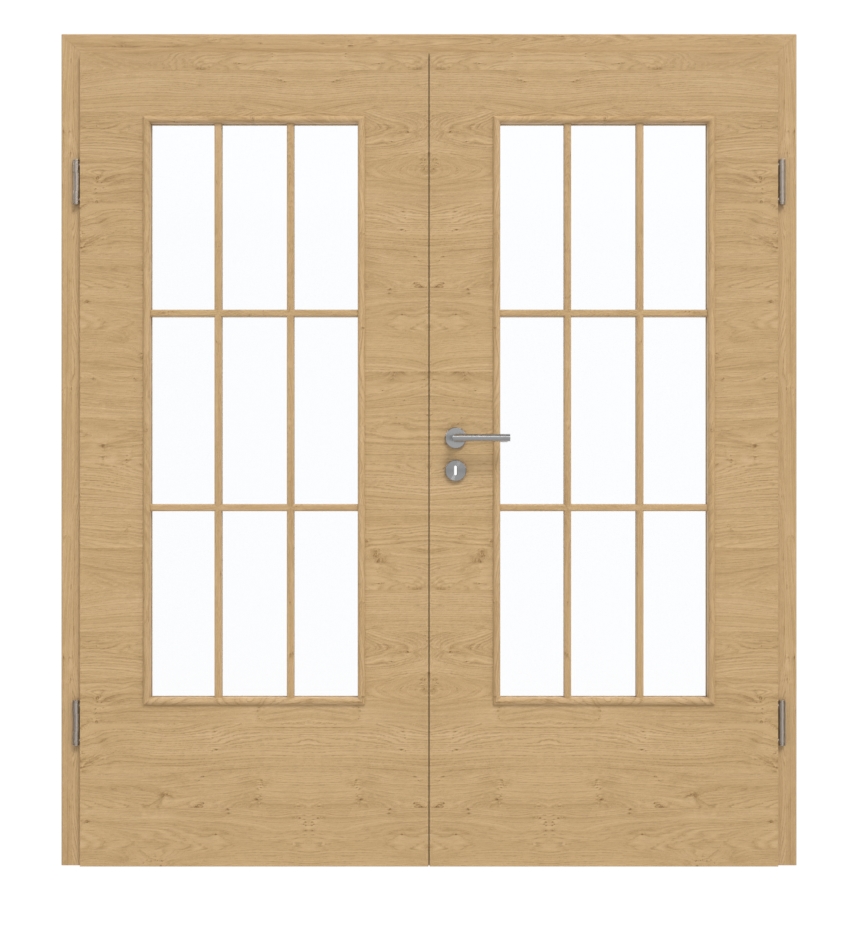 Dzięki dużym przeszkleniom drzwi zapewniają piękny dopływ światła. Delikatne ramy z listew dzielą duże prostokąty na po dziewięć mniejszych. Na pięknym wzorze Authentic Asteiche DQ widoczne są poziome słoje drewna i delikatne cieniowania. Dekoracyjna warstwa wierzchnia jest odporna na uszkodzenia oraz zarysowania i uderzenia.