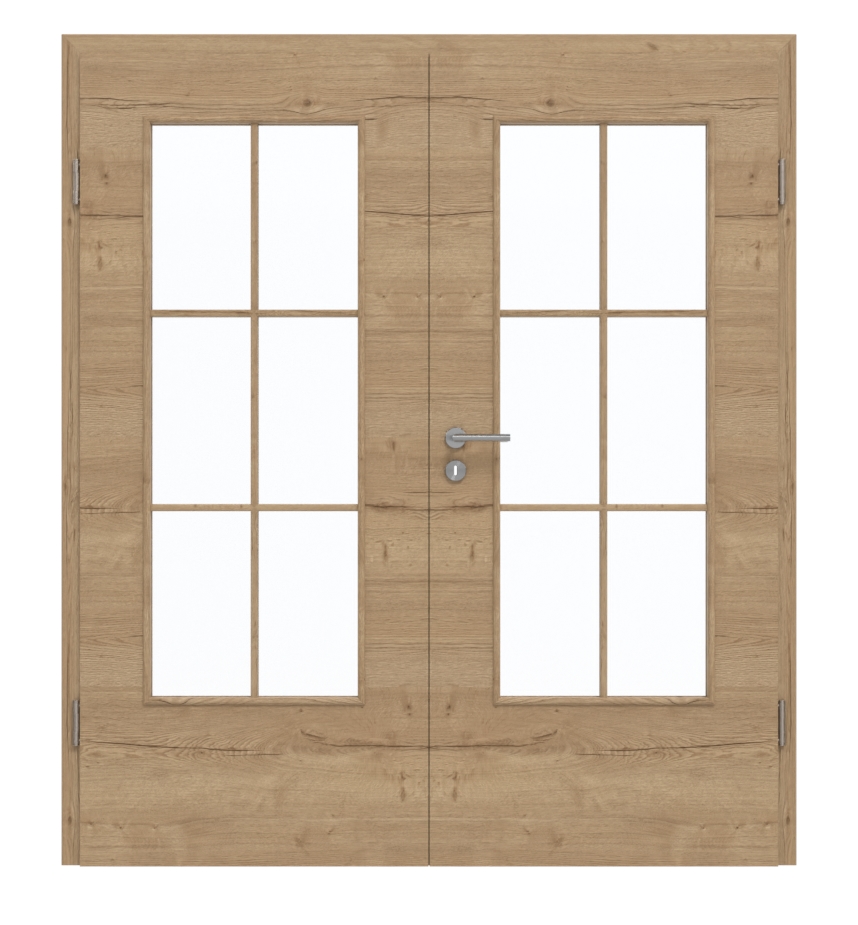 Drzwi podwójne nadają się zarówno do użytku prywatnego, jak i biurowego. Dzięki rdzeniowi z pełnego wióru odpowiadają grupie obciążeniowej M. Oprócz skrzydeł drzwiowych, w zestawie znajduje się również ościeżnica, zamek i zawiasy.