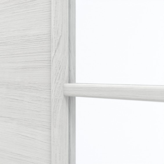 Duże przeszklenia zapewniają doskonały dopływ światła. Wystające szprychy stanowią elegancki element stylistyczny i dzielą szybę na dziewięć równych pól. Poziome cieniowania w dekorze HPL Authentic Grigio DQ tworzą naturalny wzór słojów drewna i podkreślają nowoczesny wygląd w jasnoszarym odcieniu. Zarysowania i uderzenia nie stanowią większego problemu dla tej wytrzymałej warstwy wierzchniej. Ponadto jest bardzo łatwa w czyszczeniu.