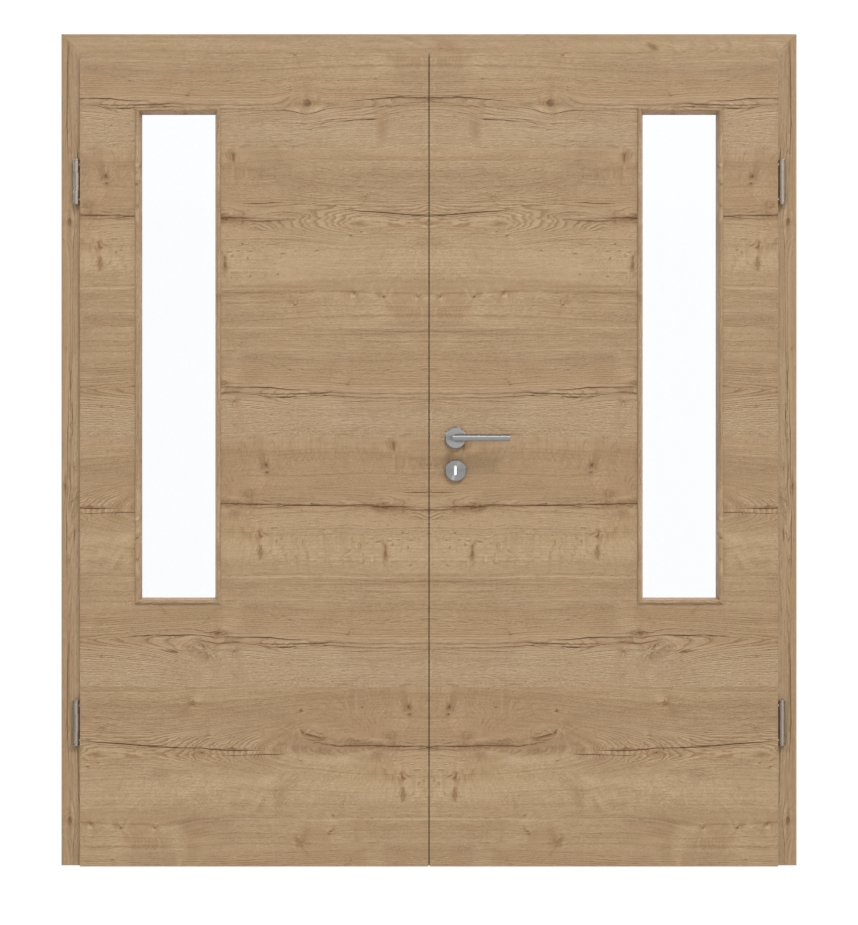 Aby wprowadzić więcej światła do pomieszczenia, krótkie, szklane wstawki umieszczone po stronie zawiasów w wąskim wykonaniu. Poziome dekoracje CPL Authentic Risseiche DQ zdobią charakterystyczne słoje. Oprócz pięknego wyglądu, materiał ten wyróżnia się wysoką stabilnością w obliczu obciążeń mechanicznych.