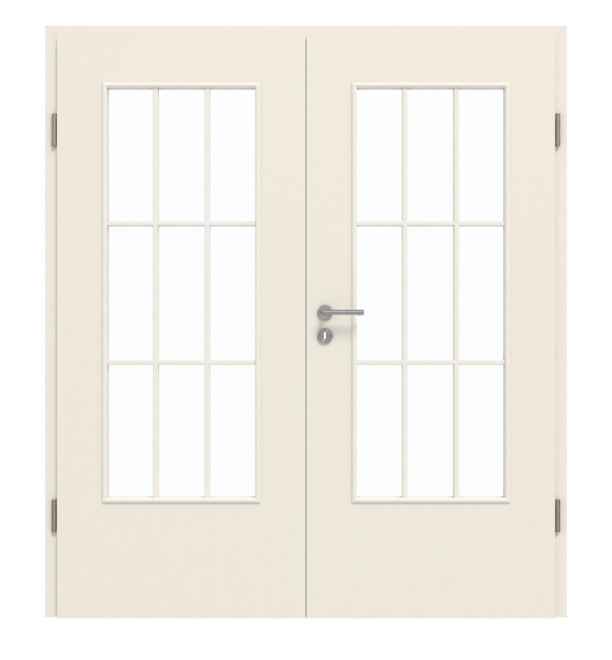 Eleganckie ramy szprosowe tworzą dziewięć jednakowych pól w obrębie wycięć na szybę. Beżowy odcień Dawn tworzy jednolitą, gładką powierzchnię na nowoczesnym skrzydle drzwiowym. Dekoracyjny laminat jest odporny na zabrudzenia, zarysowania i uderzenia.