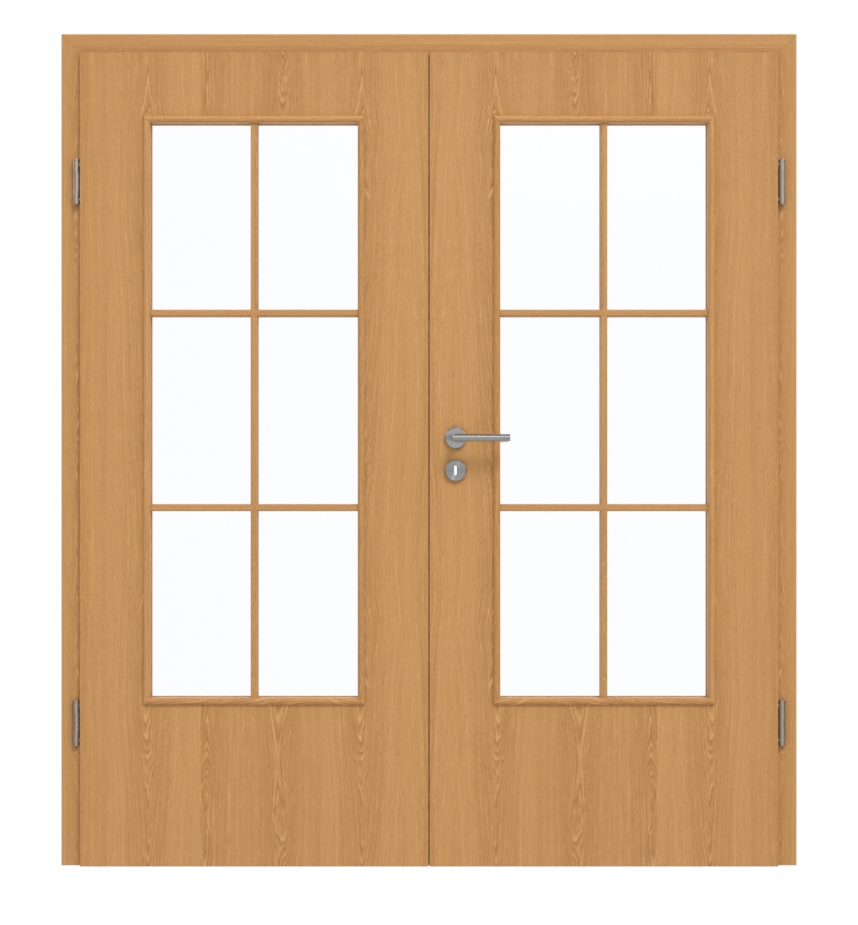 Dzięki rdzeniowi z pełnej płyty, podwójne drzwi skrzydłowe nadają się zarówno do pomieszczeń prywatnych, jak i biurowych. Zostały przetestowane w grupie obciążeniowej M. Podana cena obejmuje oba skrzydła drzwiowe, odpowiednią ościeżnicę, zamek wielozadaniowy oraz zawiasy.