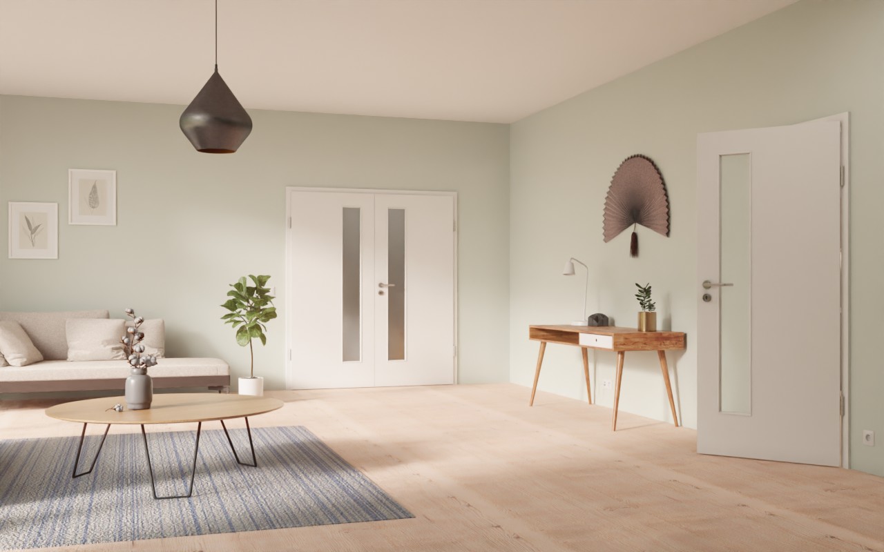 Wzdłuż długości skrzydeł drzwiowych, po stronie zamka, znajduje się wąskie wycięcie na szybę. Wysoce matowa powierzchnia G-TEC w kolorze białym charakteryzuje się praktycznym efektem antyodciskowym.