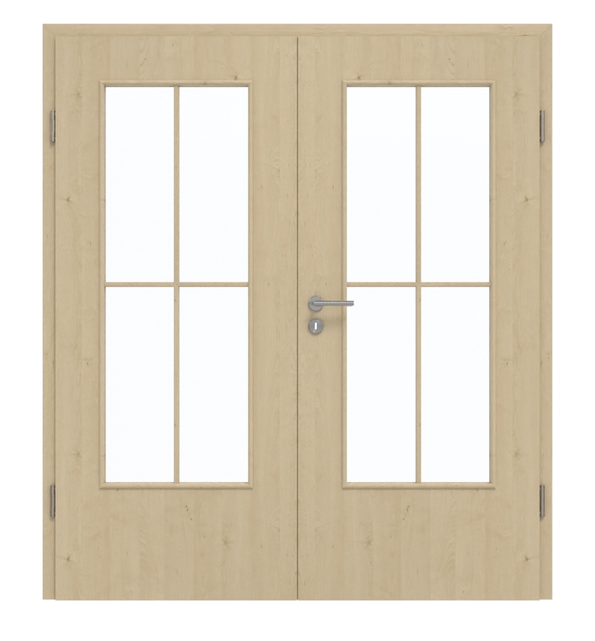 Drzwi dwuskrzydłowe nadają się zarówno do pomieszczeń prywatnych, jak i biurowych. Dzięki środkowej warstwie z pełnej płyty wiórowej spełnia wymagania grupy obciążenia M. Oprócz skrzydeł drzwiowych w zakres dostawy wchodzą również ościeżnica, zamek i zawiasy.