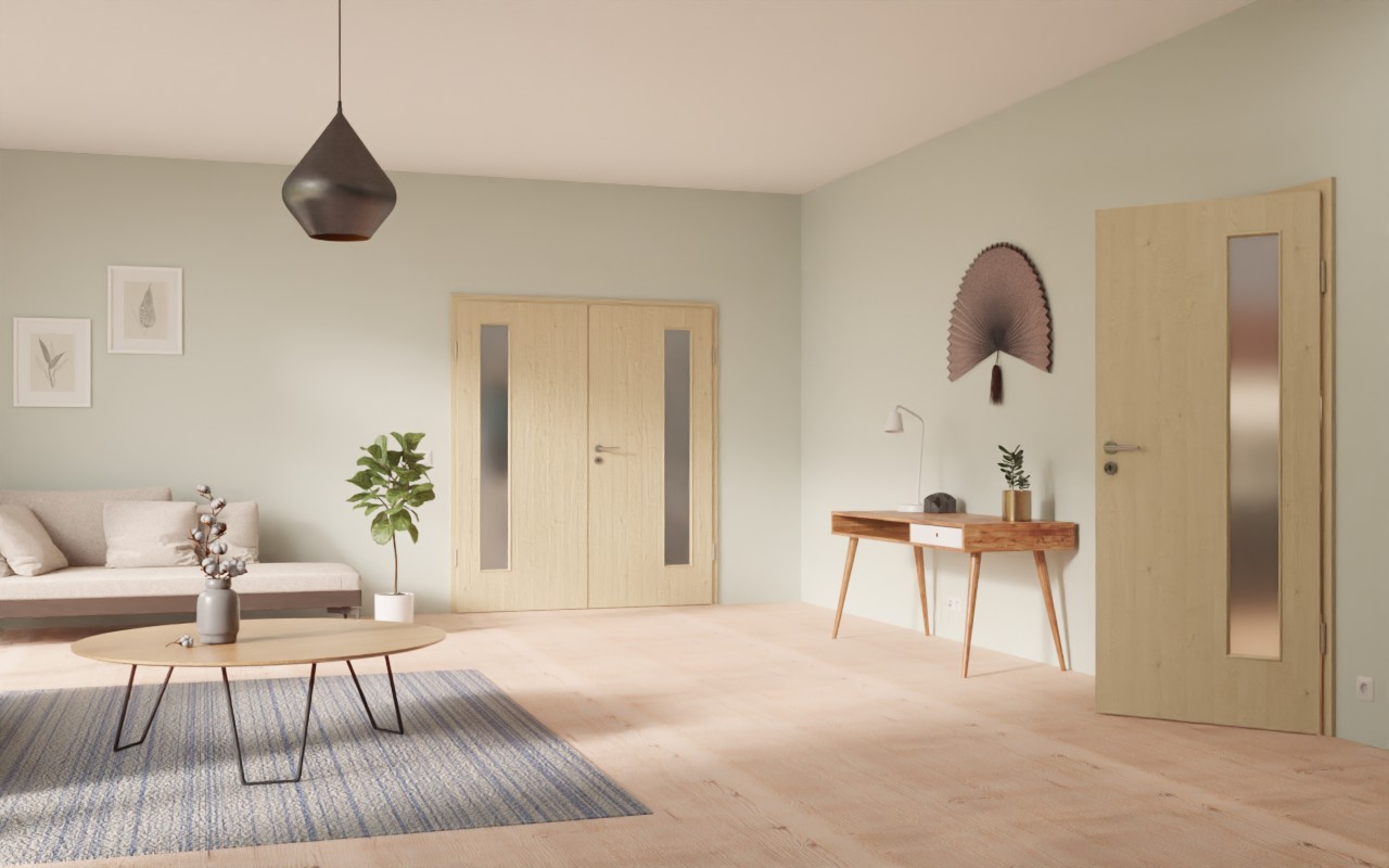 Wąskie, prostokątne wycięcia na szybę zapewniają piękny dopływ światła. Dekor HPL Natura klon tworzy spokojną atmosferę dzięki drobnym usłojeniom i jasnej kolorystyce. Ponadto ta łatwa w pielęgnacji warstwa wierzchnia wykazuje się wyjątkową odpornością na ścieranie i zarysowania.