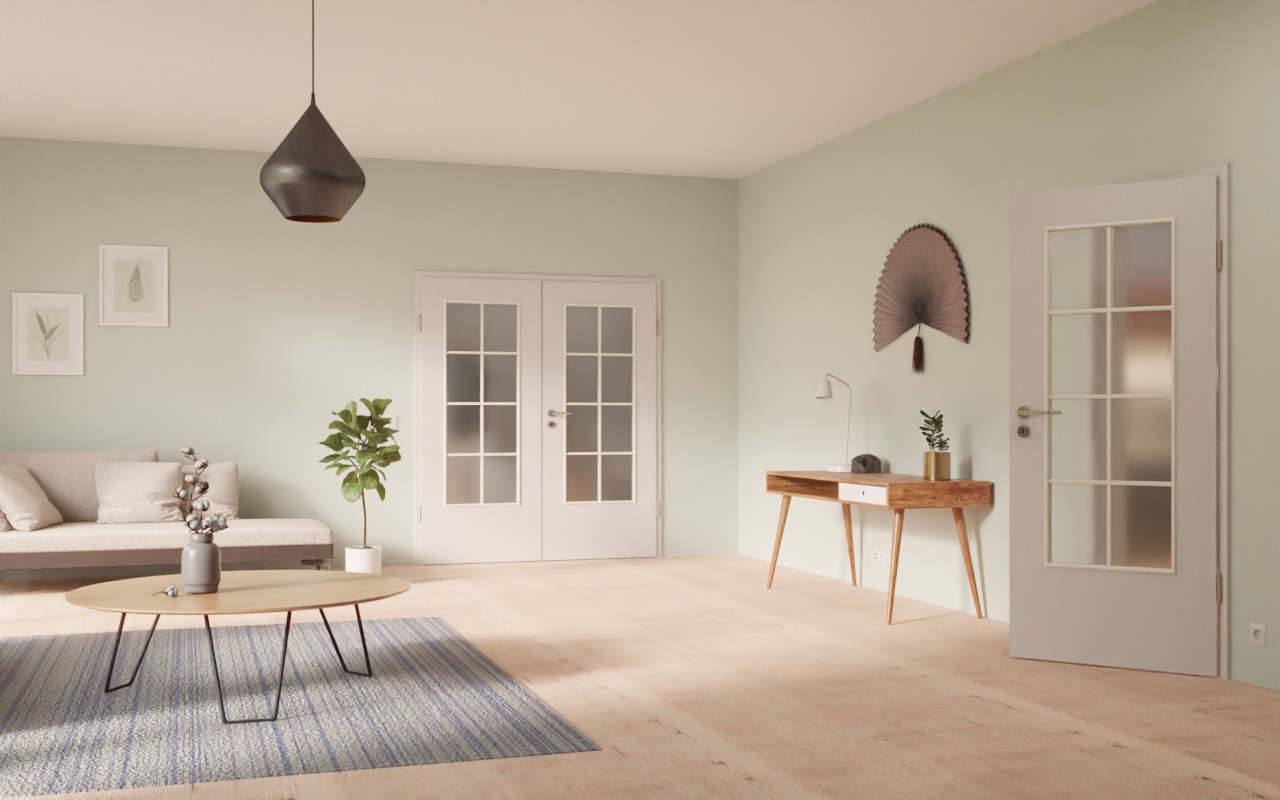 Światło z sąsiedniego pomieszczenia rozjaśnia nawet ciemne korytarze dzięki dużym przeszkleniom . Eleganckie ramy z szprosami wzbogacają harmonijny wygląd. Jasny dekor HPL Jasnoszary wyróżnia się subtelną fakturą papieru czerpanego, która nadaje mu atrakcyjny i uniwersalny wygląd. Ponadto odporna na zarysowania i uderzenia płyta laminowana jest łatwa w czyszczeniu.