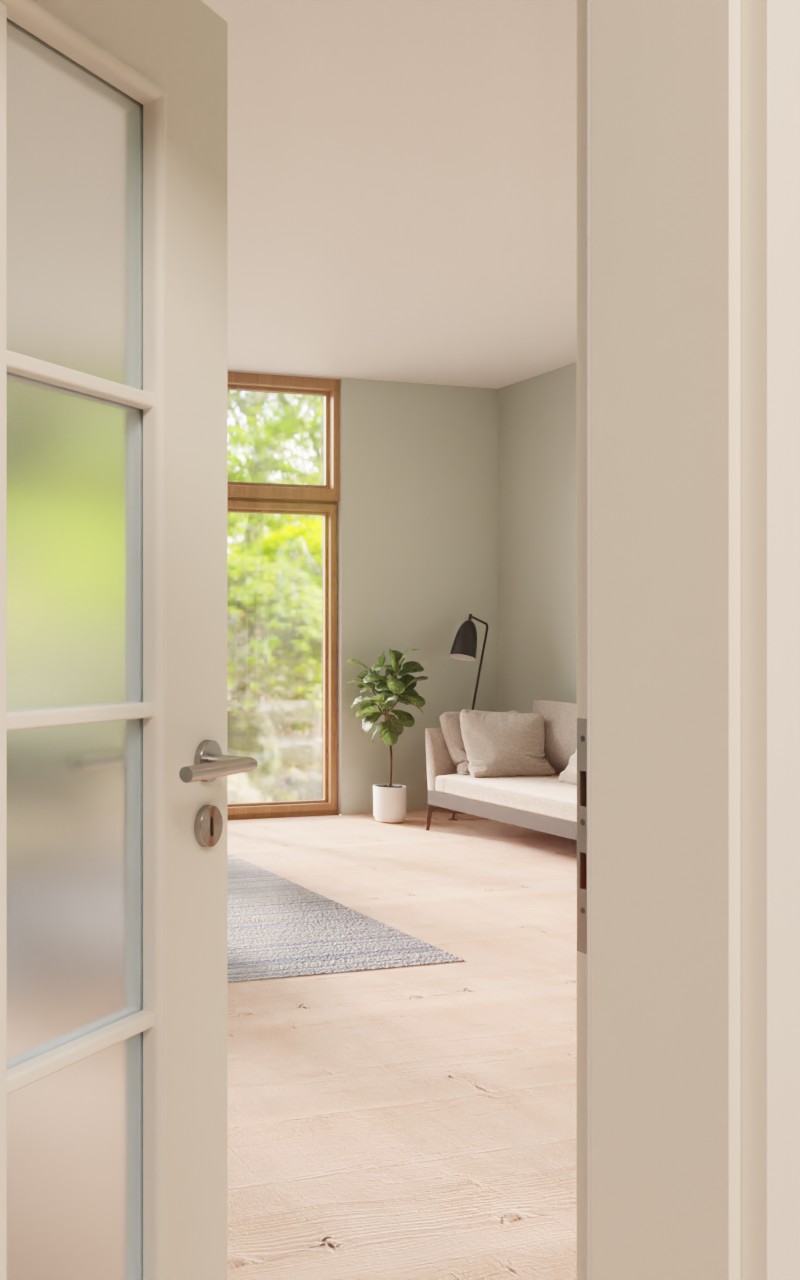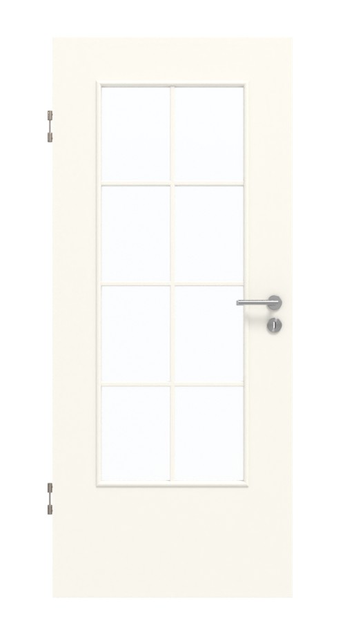 Powierzchnia skrzydła drzwiowego w kolorze biel perłowa idealnie pasuje do każdego wnętrza. Pomieszczenia, do których zazwyczaj wpada niewiele światła, zyskują dzięki dużym wycięciom na szyby. Są one elegancko podzielone za pomocą eleganckiej ramy szprosowej.