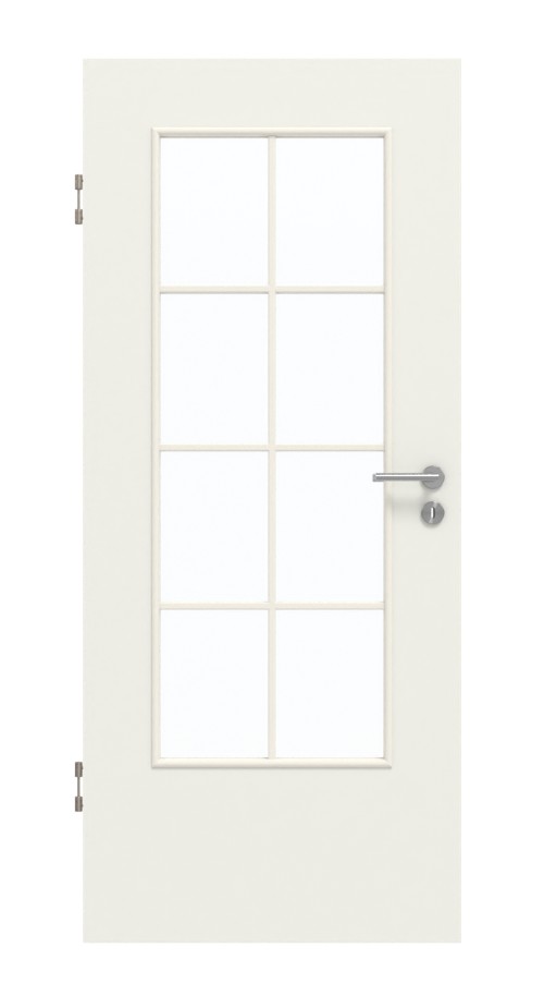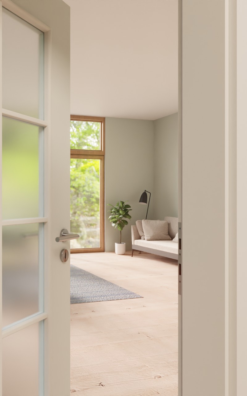 Prostokątne wycięcie na szybę zajmuje większość powierzchni skrzydła drzwiowego, zapewniając przyjemny dopływ światła. Delikatne, nakładane szprosy nadają mu piękną symetrię. Drzwi wewnętrzne mają dyskretny wygląd dzięki jasnoszarej powierzchni. Zrównoważony odcień Rain subtelnie podkreśla indywidualny wystrój wnętrza. Wysoka odporność na ścieranie i łatwość pielęgnacji to cechy charakterystyczne warstwy dekoracyjnej HPL.