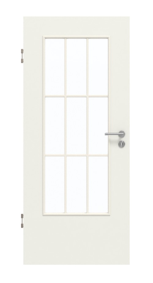 Rama z poprzeczkami elegancko dzieli szklany panel na równe pola. Dodatkowe oświetlenie jest korzystne zwłaszcza w ciemnych pomieszczeniach. Jasnoszary dekor sprawia wrażenie powściągliwego. Kolor sprawia wrażenie zrównoważonego i spokojnego. Wysoka odporność na ścieranie i łatwość pielęgnacji to cechy charakterystyczne warstwy dekoracyjnej HPL.