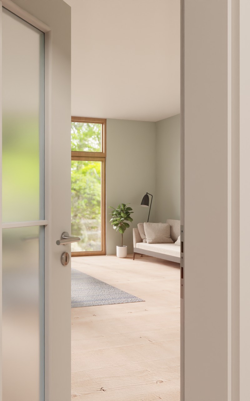 Srebrnoszare skrzydło drzwiowe CPL zapewnia drobne kontrasty i prostą nowoczesność. W przypadku ciemnych pomieszczeń duże wycięcie na szybę z eleganckimi ramami szprosowymi stanowi dodatkowy atut, ponieważ zapewnia dodatkowy dopływ światła.