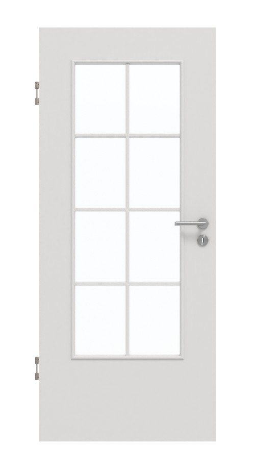 Proste i nowoczesne srebrnoszare skrzydło drzwiowe CPL idealnie komponuje się z Twoim wnętrzem. Nałożona rama szprosowa dzieli duże przeszklenie na osiem równych pól.
