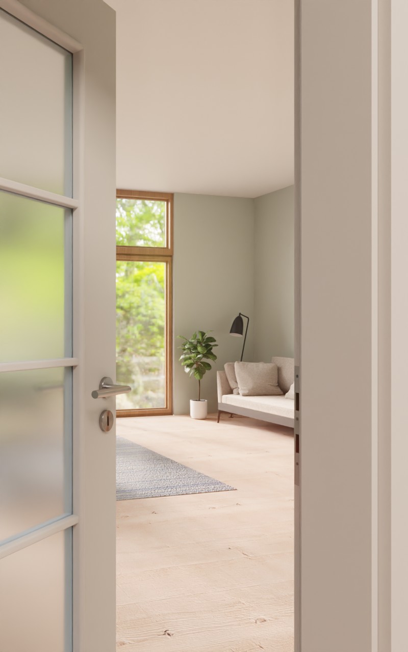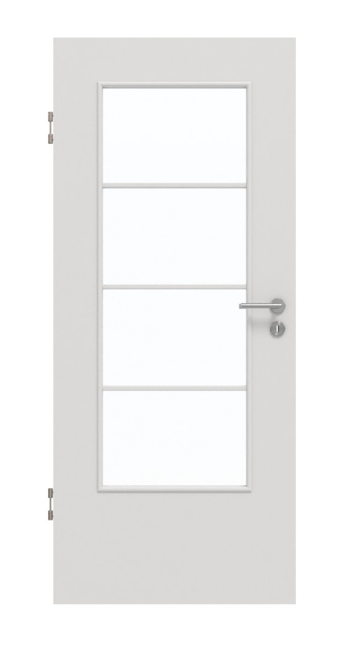 Cała powierzchnia skrzydła drzwiowego pokryta jest srebrnoszarą warstwą CPL. Dzięki dużemu przeszkleniu drzwi przepuszczają światło z jednego pomieszczenia do drugiego. Delikatne pręty dzielą szybę na cztery ułożone jedna nad drugą sekcje.