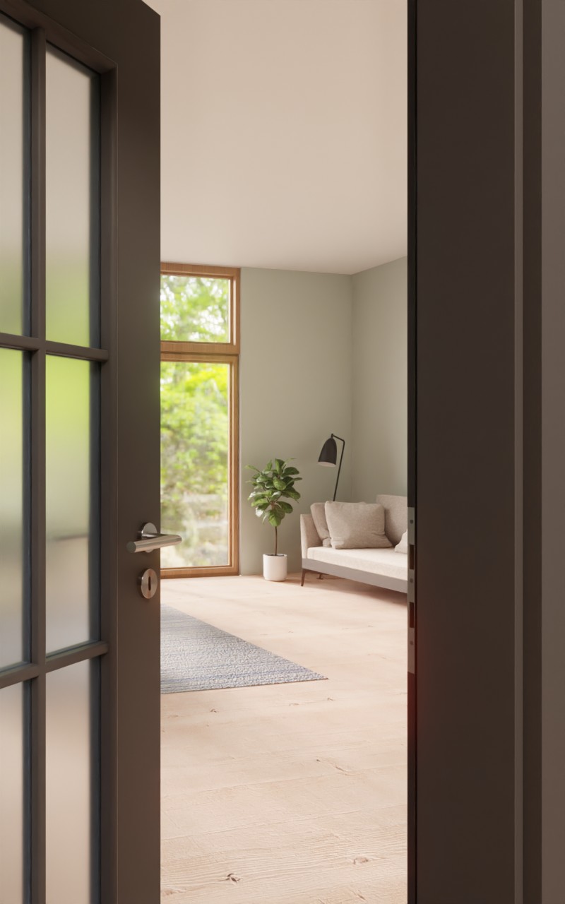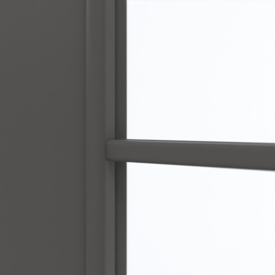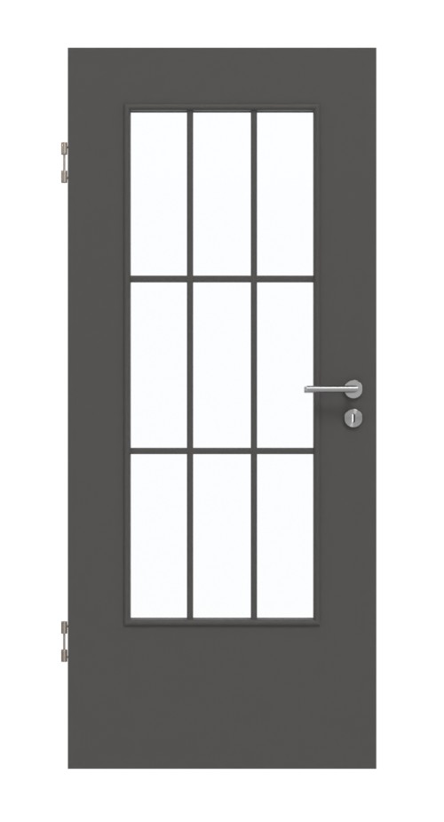 Antracytowy kolor skrzydła drzwiowego CPL tworzy nowoczesne kontrasty w Twoim wnętrzu. Dzięki dużemu wycięciu na szybę drzwi gwarantują odpowiedni dopływ światła. Delikatna rama szprosowa dzieli duży prostokąt na dziewięć mniejszych.