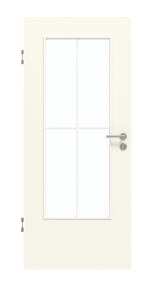 Powierzchnia CPL nowoczesnego skrzydła drzwiowego jest śnieżnobiała i bez problemu pasuje do każdego wnętrza. Duże przeszklenie jest podzielone ramą szprosową na cztery równe prostokąty.