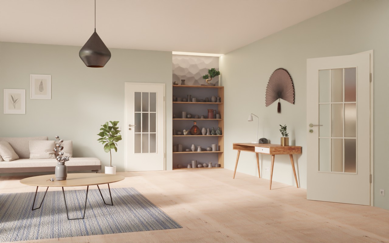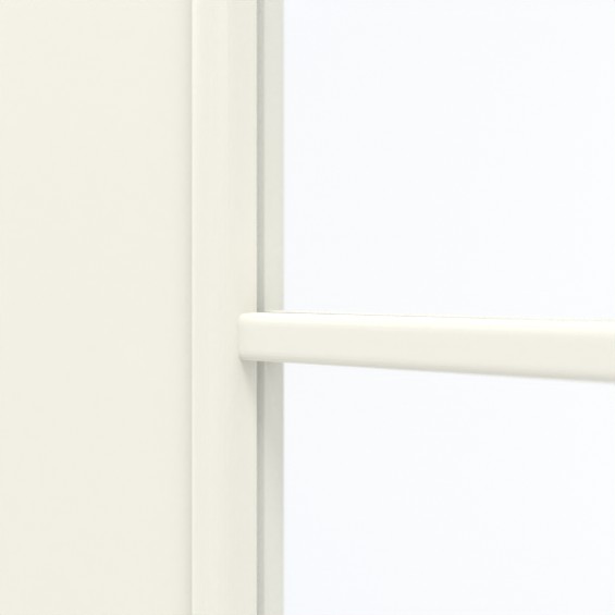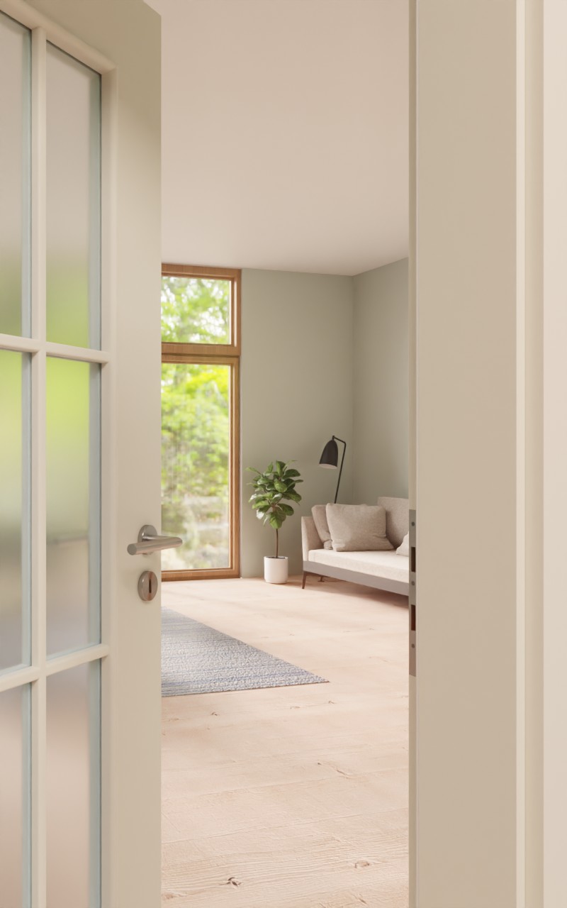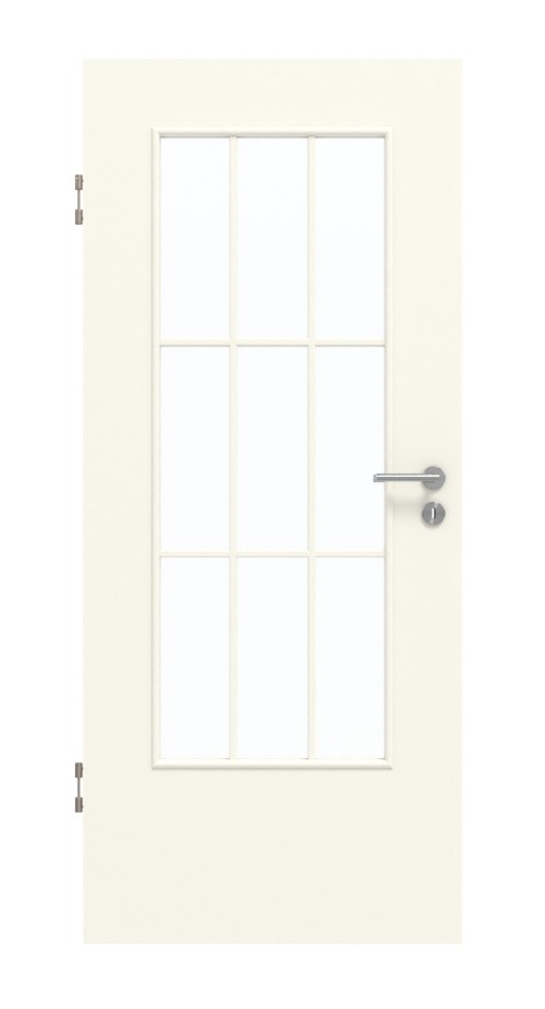 Dzięki swojej gładkiej, śnieżnobiałej powierzchni skrzydło drzwiowe CPL idealnie wpasowuje się w koncepcję wystroju wnętrza. Duże wycięcie na szybę zapewnia doskonały dopływ światła. Nałożone szprosy stanowią elegancki element stylistyczny i dzielą szkło na dziewięć równych pól.