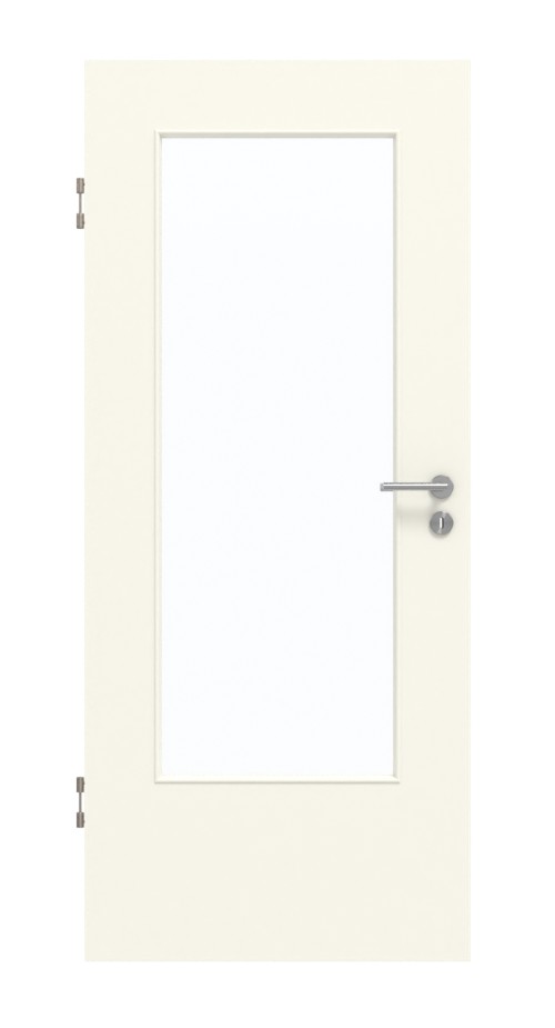 Śnieżnobiała powierzchnia skrzydła drzwiowego CPL nadaje pomieszczeniu ponadczasową elegancję i idealnie komponuje się z wystrojem wnętrza. Duże, prostokątne przeszklenie wypełnia większość skrzydła drzwiowego.