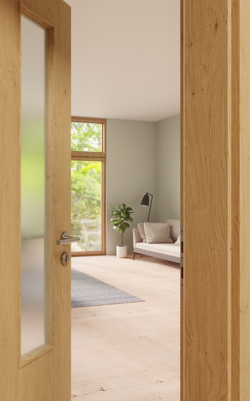 Zapraszające drzwi wewnętrzne w dekorze HPL Authentic Asteiche z atrakcyjnym przeszkleniem: