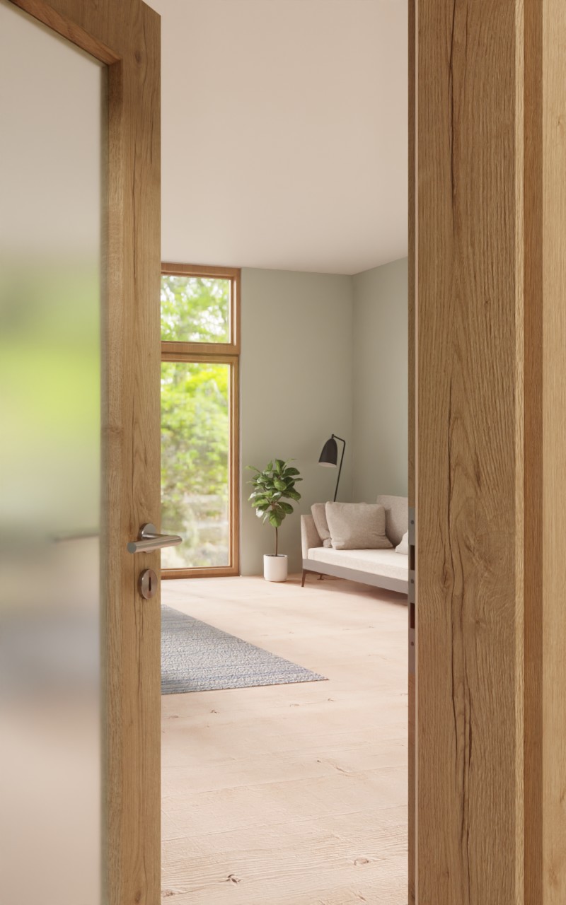 Duży przeszklony fragmentzapewnia doskonały dopływ światła. W dekorze Authentic dąb szczelinowy pojawia się charakterystyczny wzornik, który imituje sęki i wyraźne słoje roczne. Ponadto warstwa wierzchnia z HPL wyróżnia się wysoką odpornością na zarysowania i ścieranie oraz łatwością w pielęgnacji.