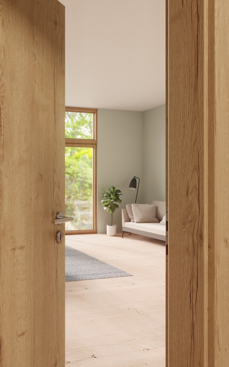 Dzięki wyraźnym usłojeniom, które oprócz otworów po sękach imitują żywe linie rocznych słojów, możesz cieszyć się szczególnie naturalnym-rustykalnym wyglądem dekoru Authentic Risseiche. Dekoracyjnie, krótki, wąski świetlik rozciąga się wzdłuż górnej części drzwi.