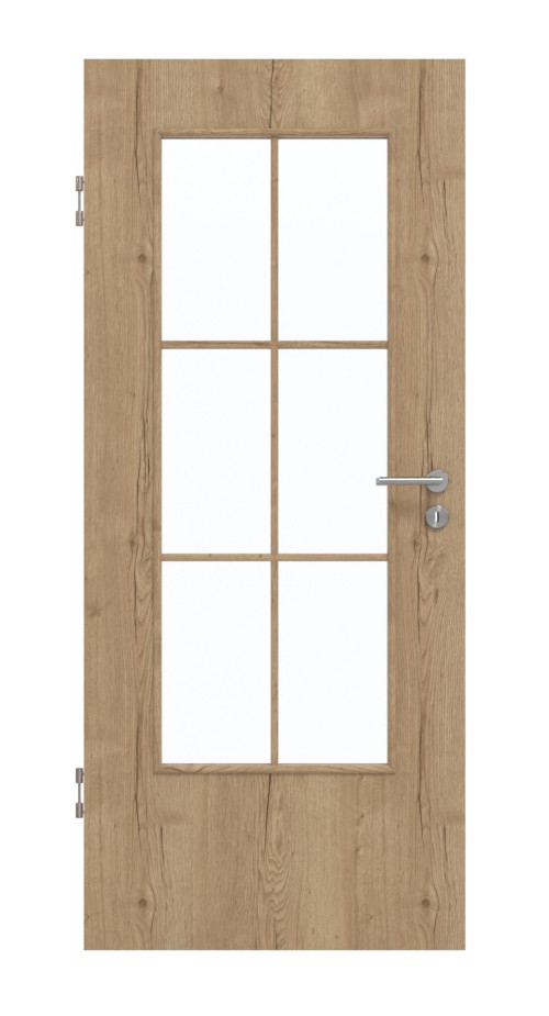 Dekor autentyczny dąb rysowany imponuje wyrazistym wzorem, który umiejętnie imituje słoje i otwory po gałęziach. Delikatne listwy dzielą prostokątny otwór szklany na sześć równych pól.