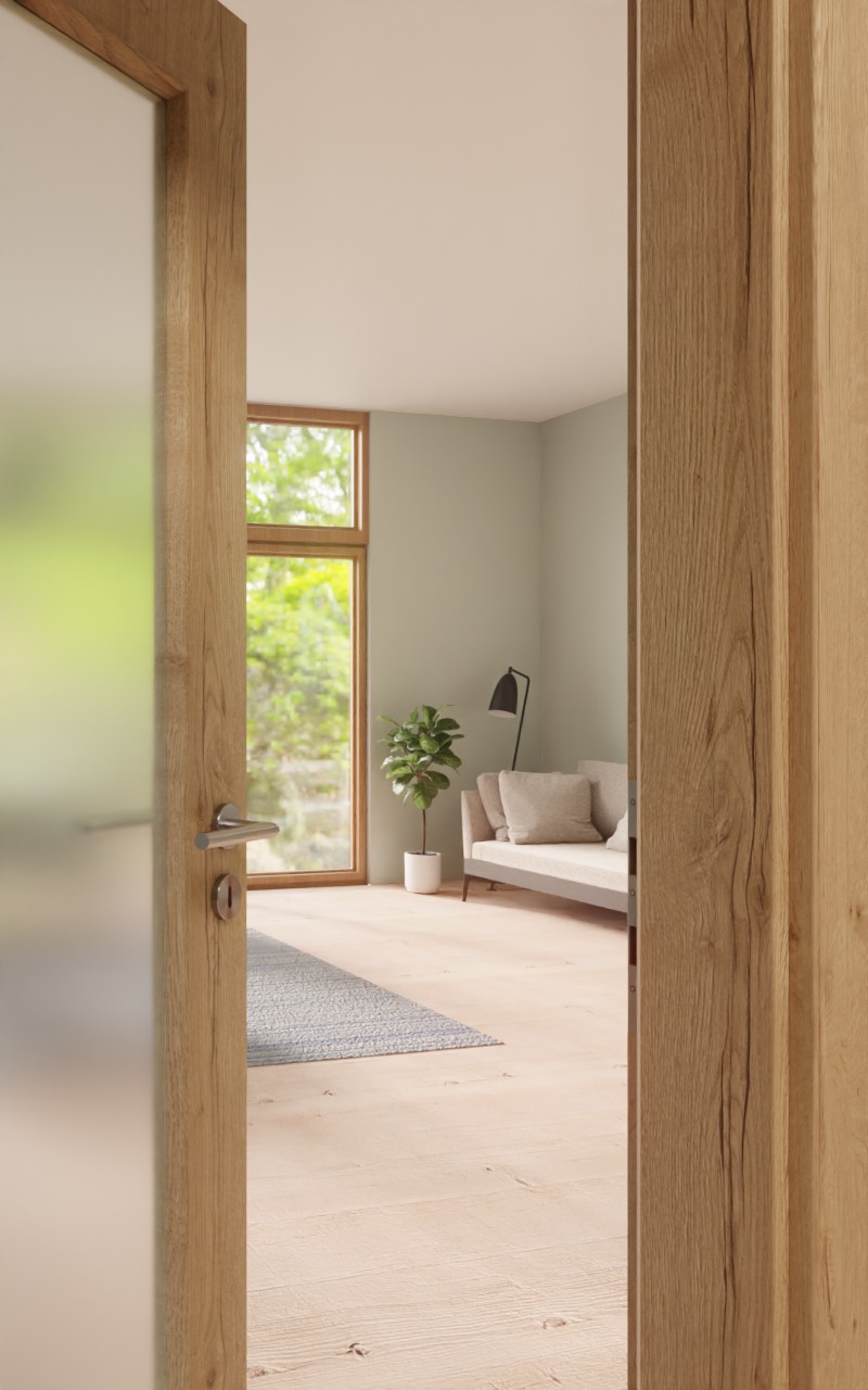 Gwarancja atmosfery komfortu: Drzwi wewnętrzne LA-2 w autentycznym dębie rysowanym producenta Garant dopełniają nowoczesne wnętrze.