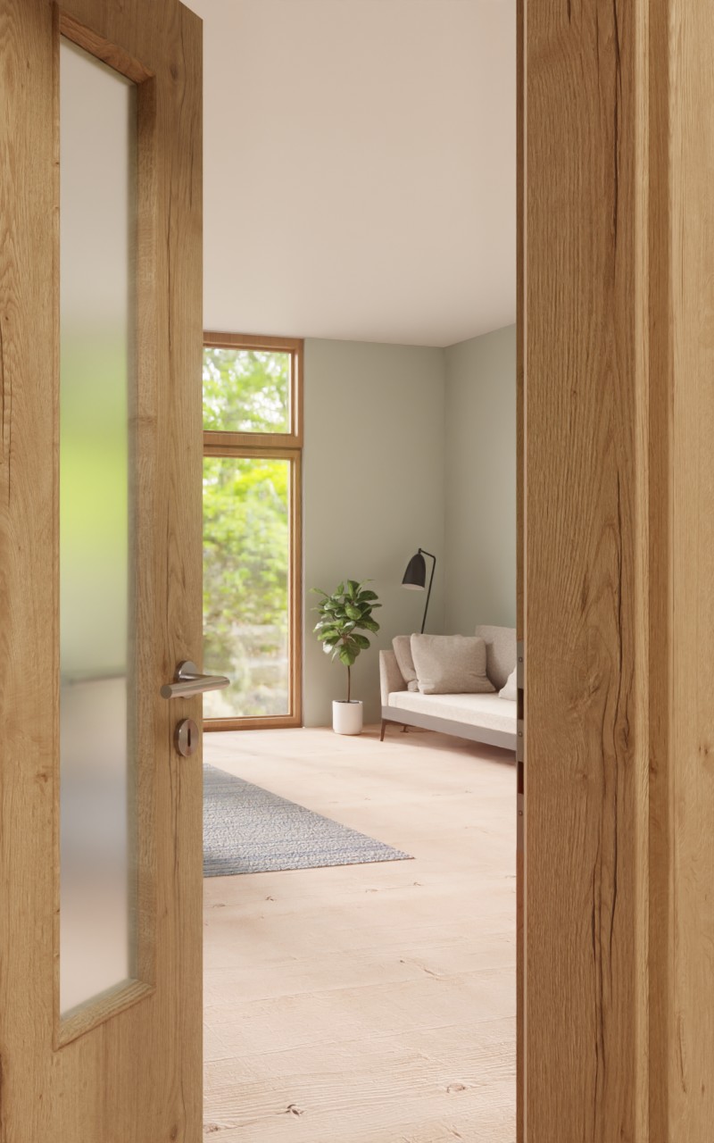 Wykończenie Authentic Risseiche charakteryzuje się wyrazistym wzorem, który naśladuje otwory po sękach i wyraźnie widoczne pierścienie roczne. Kulminacyjnym punktem designu jest wąski przeszklenie, które zdobi drzwi od strony zamka.