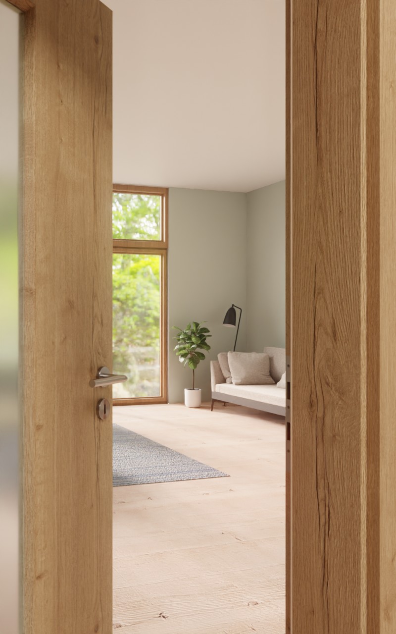 Wąski, prostokątny wycięcie w szybie zapewnia piękny dopływ światła. Na dekorze Authentic dąb szczelinowy widoczne są wyraźne słoje roczne i sęki, które nadają mu wyjątkowy rustykalny urok. Łatwa w pielęgnacji warstwa wierzchnia z HPL wyróżnia się również wysoką wytrzymałością.