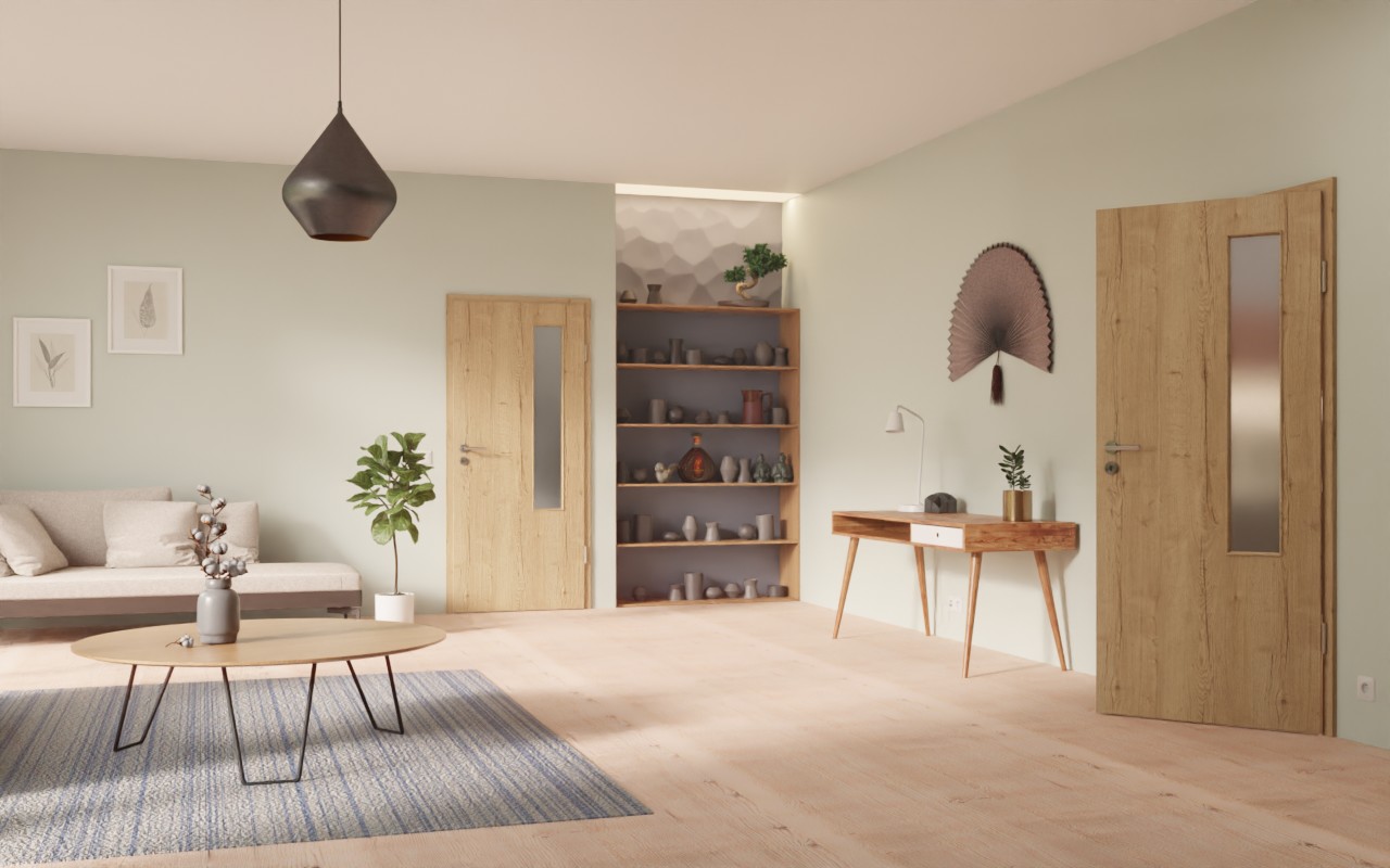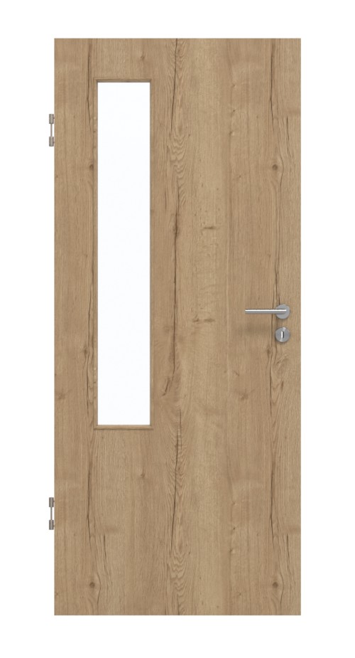 W górnej części drzwi, od strony zawiasów, znajduje się krótki, wąski wycięty fragment szkła , który stanowi ozdobny akcent. Wyrazisty wzornik imitujący sęki i słoje drzew charakteryzuje dekor Authentic dąb szczelinowy. Łatwa w pielęgnacji warstwa wierzchnia z HPL wyróżnia się również wysoką wytrzymałością.