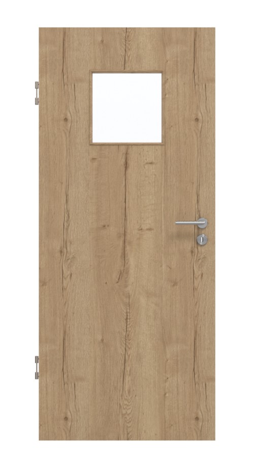 Wyrazisty wzór, który imituje słoje i sęki, charakteryzuje dekor autentyczny dąb rysowany. W górnej części drzwi znajduje się kwadratowe przeszklenie.